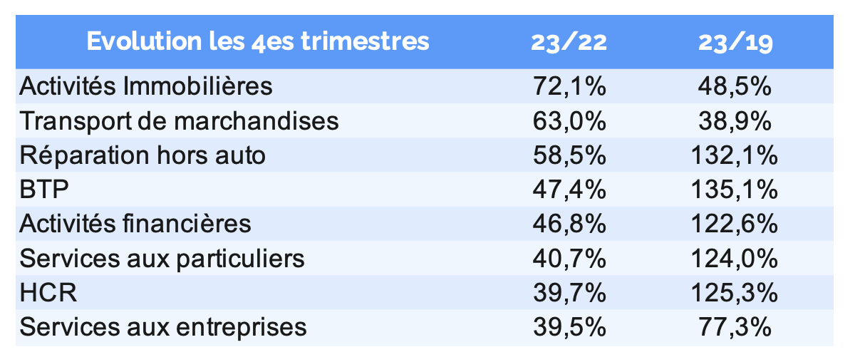 Les activités finance/assurance, immobilières et informatiques connaissaient les évolutions les moins favorables entre +40 et +46 % au regard de 2022, vs en moyenne 36 %. Ces évolutions défavorables sont aussi fréquentes si l’on compare 2019 à 2023.Ces évolutions défavorables ont 3 types d’origine : soit un secteur en difficulté conjoncturelle (BTP et immobilier, finance), soit un secteur en forte évolution (informatique), soit un secteur en habituelle situation de défaillance (HCR, qui plus est en forte reprise depuis le covid).