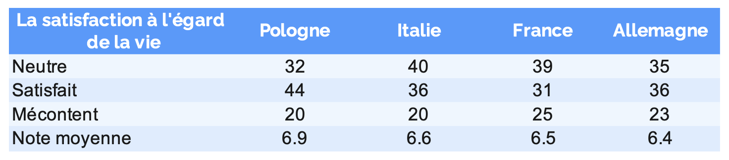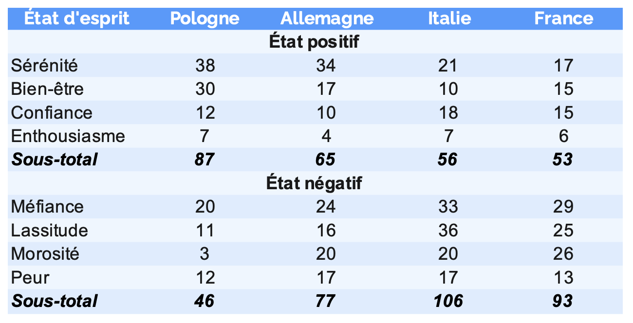 ♦ Les Français proches des Italiens ont un état d’esprit actuel fort négatif, bien plus que les Allemands et les Polonais.