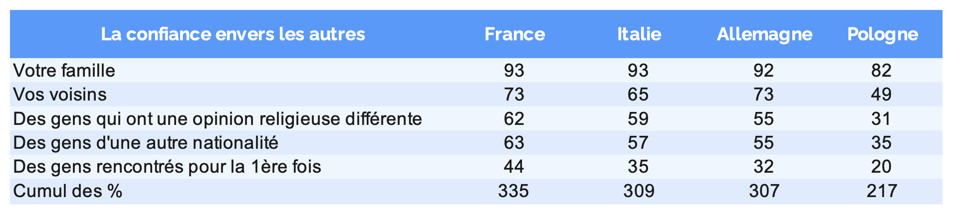 ♦ Les Français ont plutôt davantage confiance aux autres (moins lors d’une 1ère rencontre), suivis de façon assez proche par les Allemands et les Italiens mais distançant nettement les Polonais.