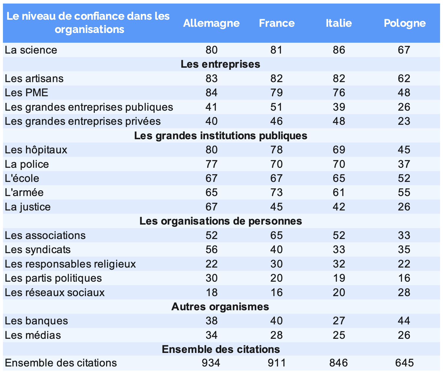 ♦ Ils font comme les Allemands largement confiance à la science, aux TPE et PME, aux grandes institutions publiques, aux associations et syndicats mais nettement moins aux grandes entreprises, aux banques et médias, aux responsables politiques et religieux et encore moins aux réseaux sociaux.