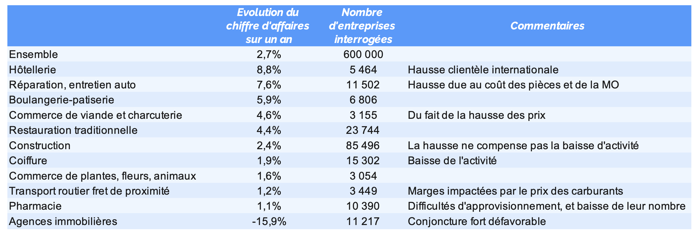 L’hôtellerie, la boulangerie-pâtisserie et la réparation auto ont connu les plus fortes hausses sur un an alors que les pharmacies, les commerces de plantes et le transport de proximité ont connu la stabilité et agences immobilières une forte baisse.