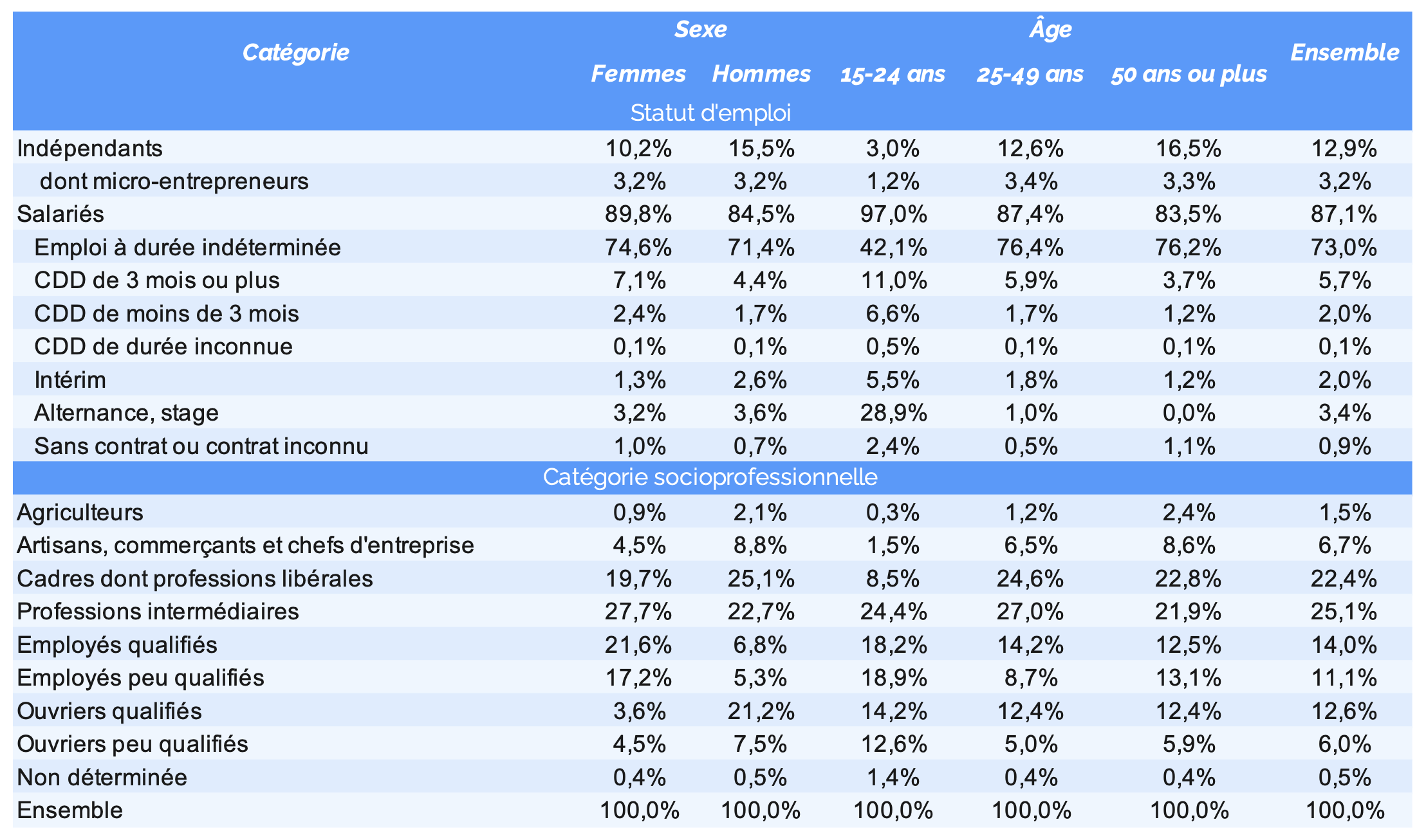 - Les 15-24 ans sont majoritairement employés ou ouvriers (64), alors que 8,5 % sont cadres.