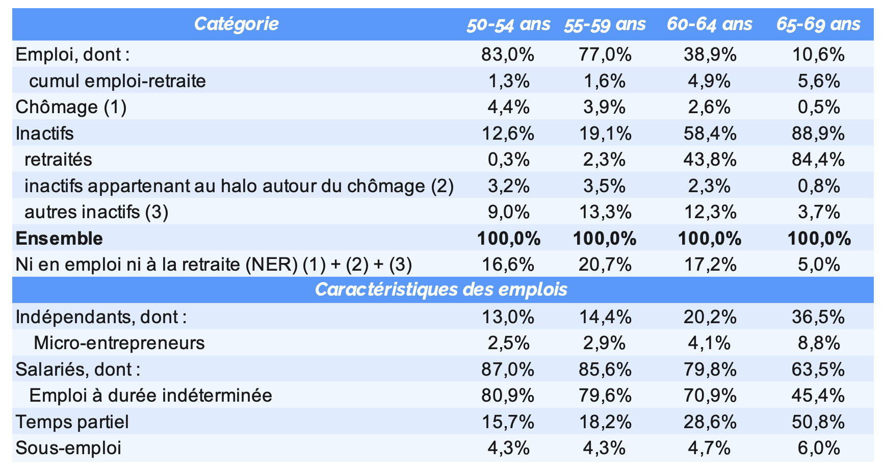 Moins fréquemment dans le halo (3%), les seniors sont aussi les moins exposés au risque de chômage (3,7% pour les 50-64 vs 5,5% pour l’ensemble des personnes de 15 à 64 ans et jusqu’à 7,3% pour les 15-24 ans).