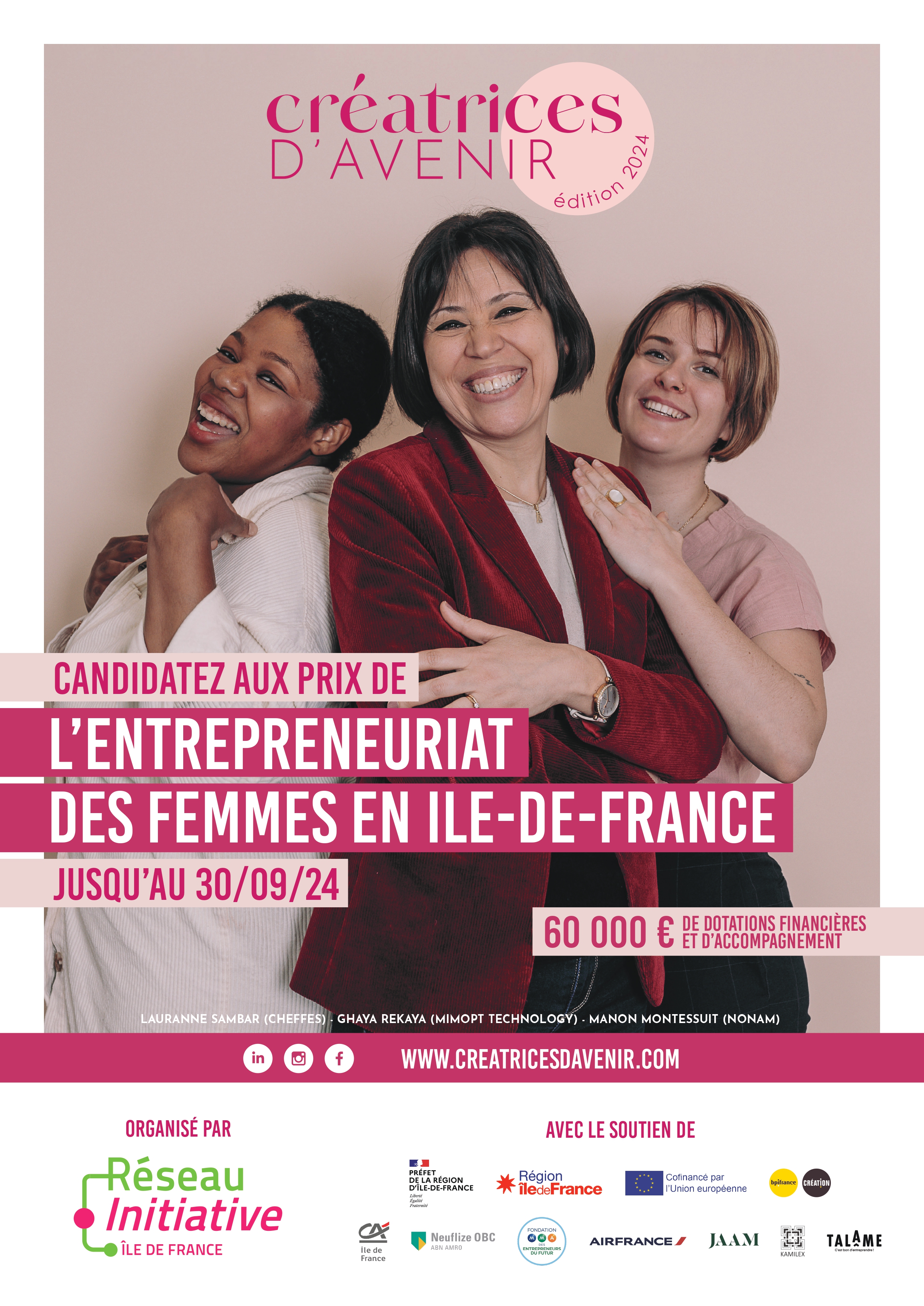 - Prix Quartiers : ce prix est accessible aux entrepreneures issues ou habitantes d’un quartier prioritaire de la politique de la ville (QPV).