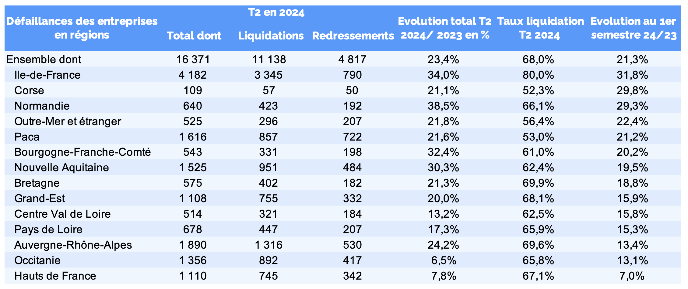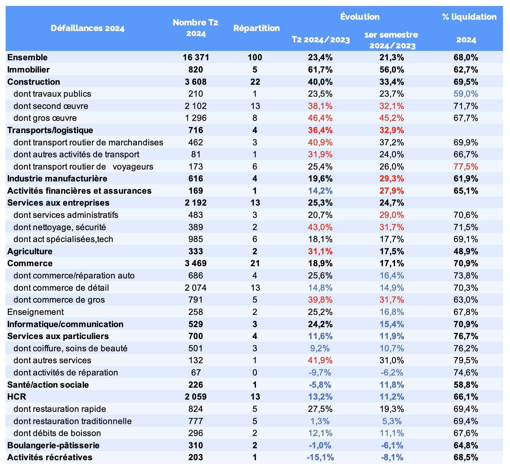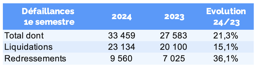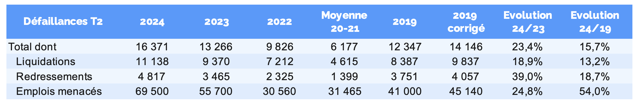 16 371 défaillances au 2e trimestre, en hausse de 23,4 % comparé à 2023, notamment dans la procédure redressement (+39 %), nettement plus que pour les liquidations judiciaires (+19 %).