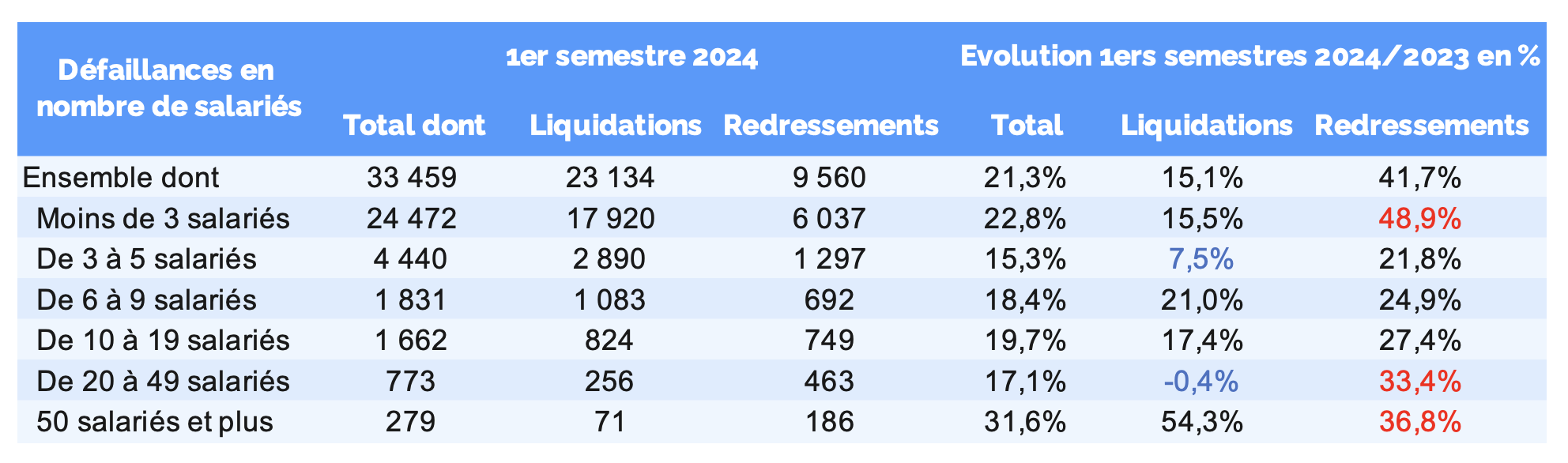 L’observation des défaillances du 1er semestre permet de prendre un peu de recul avec un temps plus long. Les entreprises de moins de 3 salariés sont 23 % de plus au 1er semestre 2024 (vs 26 au 2e trimestre), avec un peu moins de liquidations (15,5 au lieu de 20) mais tout autant de redressements (49 %).