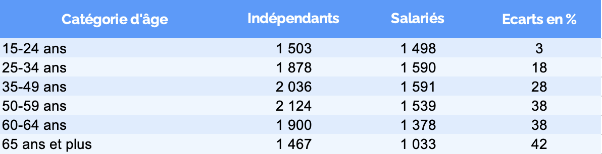 La différence entre indépendants classiques et salariés provient du nombre de jours travaillés (253 jours vs 206), d’une durée journalière plus longue (8,5 heures vs 7,5), et d’absence plus fréquente des salariés pour congés non rémunérés (17,9 jours vs 31,6 les salariés) et pour congés maladie (4,5 jours vs 13,1).