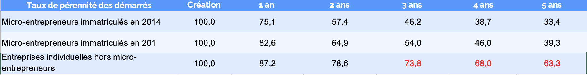 ♦ En 2018, 750 000 entreprises ont été créées en France, dont 53 % sous le régime du microentrepreneur ; 70 % ont démarré leur activité, c’est‑à‑dire déclaré au moins un chiffre d’affaires non nul durant les 8 trimestres suivant l’immatriculation. Parmi eux, 39 % sont pérennes “administratifs” à 5 ans (au regard de leur immatriculation toujours en cours) mais seulement 28 % sont encore actifs économiques à 5 ans.A titre de comparaison, le taux de pérennité à cinq ans des entreprises individuelles autres atteint 63%, celui des sociétés 71 %. De l’ordre de 3 à 5 % ne sont plus microentrepreneur parce qu’ils ont changé de statut juridique (société ou entrepreneur individuel « classique »).